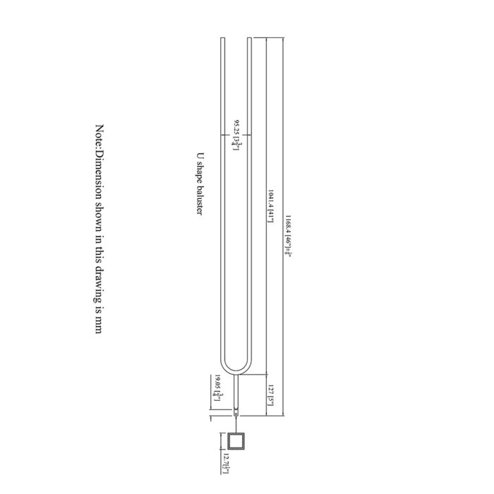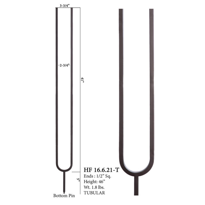 The 16.6.21-T is an iron baluster that features a double leg long U-shaped arch on the base. This baluster is hollow wrought iron and is 1/2″ square. It uses the 1/2″ shoes such as 16.3.19 and 16.3.2.